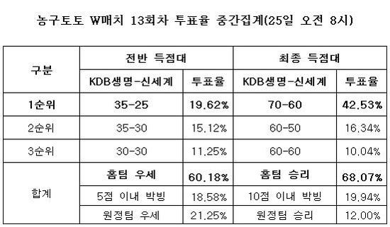 국민체육진흥공단(www.kspo.or.kr)이 발행하는 체육진흥투표권 수탁사업자인 스포츠토토의 공식 온라인 발매 사이트 베트맨(www.betman.co.kr)이 오는 26일 오후 5시 구리시체육관에서 벌어지는 KDB생명-신세계전 대상 농구토토 W매치 13회차 게임 투표율을 중간 집계한 결과, 전체 참가자의 68.07%는 KDB생명의 압승을 내다봤다고 밝혔다.