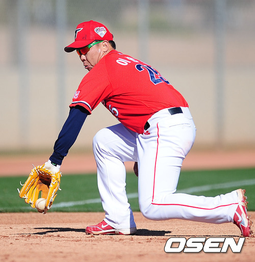 25일(한국시간) 미국 애리조나주 서프라이즈 '캔자스시티 로열스 컴플렉스'에서 진행된 KIA 스프링캠프에서 이범호가 수비훈련을 하고 있다.
