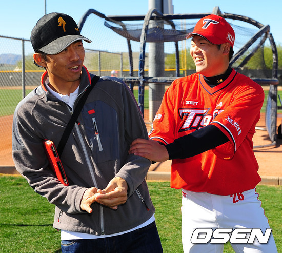 25일(한국시간) 미국 애리조나주 서프라이즈 '캔자스시티 로열스 컴플렉스'에서 진행된 KIA 스프링캠프에서 이 곳을 방문한 야구선수 출신 손혁이 고우석과 즐겁게 얘기를 나누고 있다.