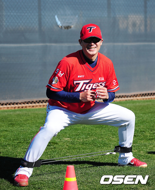 25일(한국시간) 미국 애리조나주 서프라이즈 '캔자스시티 로열스 컴플렉스'에서 진행된 KIA 스프링캠프에서 서재응이 환하게 웃으며 근력 훈련을 하고 있다.