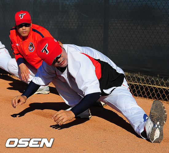 25일(한국시간) 미국 애리조나주 서프라이즈 '캔자스시티 로열스 컴플렉스'에서 진행된 KIA 스프링캠프에서 이종범이 박준수 앞에서 스트레칭을 하고 있다.