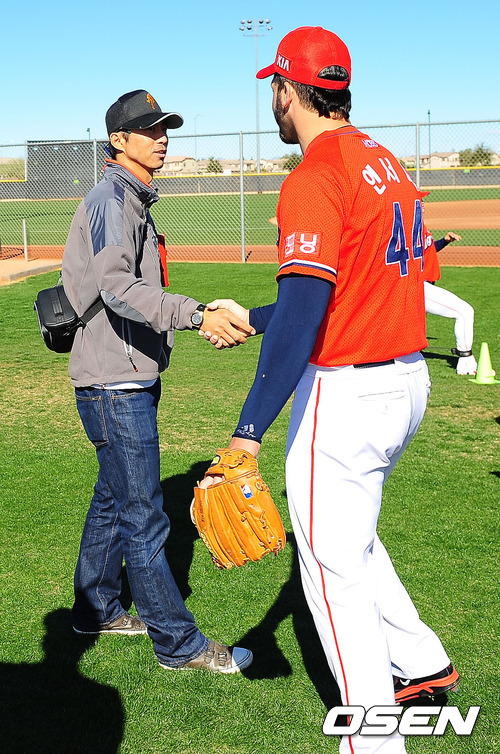 25일(한국시간) 미국 애리조나주 서프라이즈 '캔자스시티 로열스 컴플렉스'에서 진행된 KIA 스프링캠프에서 이 곳을 방문한 야구선수 출신 손혁이 앤서니와 악수를 나누고 있다.