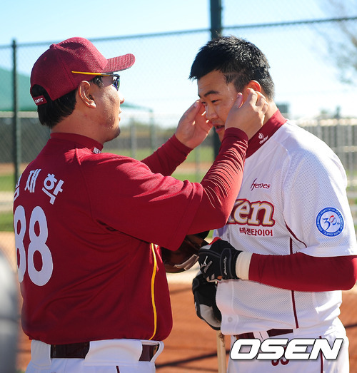 25일(한국시간) 미국 애리조나주 서프라이즈 '텍사스 레인져스 볼파크'에서 진행된 넥센 스프링캠프에서 오재일이 타격훈련 후 심재학 코치에게 혼나고 있다.
