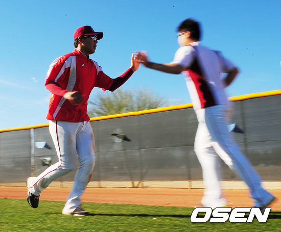 25일(한국시간) 미국 애리조나주 서프라이즈 '텍사스 레인져스 볼파크'에서 진행된 넥센 스프링캠프에서 야수조 강정호가 달리기 훈련을 하던 중 반대편으로 달리는 투수조 선수들과 하이파이브를 하며 뛰고 있다.