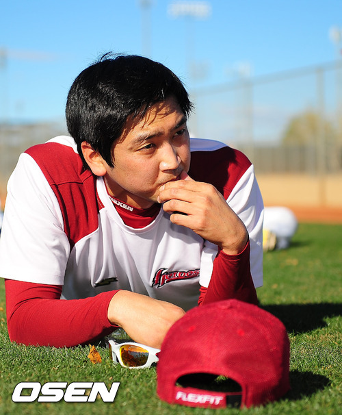 25일(한국시간) 미국 애리조나주 서프라이즈 '텍사스 레인져스 볼파크'에서 진행된 넥센 스프링캠프에서 달리기 훈련을 마치고 심수창이 휴식을 취하고 있다.