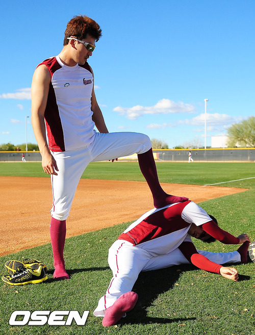 25일(한국시간) 미국 애리조나주 서프라이즈 '텍사스 레인져스 볼파크'에서 진행된 넥센 스프링캠프에서 김성태가 박성훈의 스트레칭을 도와주고 있다.