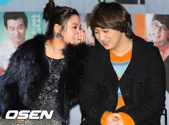 25일 오후 서울 용산CGV에서 진행된 MBC에브리원 시트콤 '할 수있는 자가 구하라'(윤성호 감독) 언론시사회에서 배우 박희본과 개그맨 황제성이 귓속말을 나누고 있다.