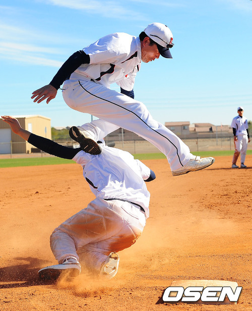 26일(이하 한국시간) 미국 애리조나주 피오리아 '피오리아 스포츠 콤플렉스'에서 진행된 두산 스프링캠프에서 두산 정수빈이 슬라이딩을 할때 김민호 코치가 점프하며 피하는 훈련을 하고 있다.