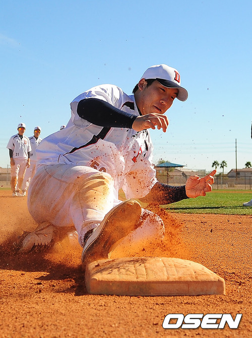 26일(이하 한국시간) 미국 애리조나주 피오리아 '피오리아 스포츠 콤플렉스'에서 진행된 두산 스프링캠프에서 두산 김현수가 슬라이딩 훈련을 하고 있다.