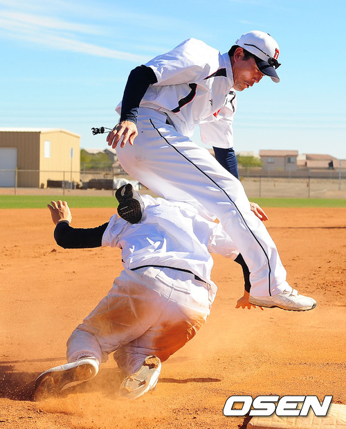 26일(이하 한국시간) 미국 애리조나주 피오리아 '피오리아 스포츠 콤플렉스'에서 진행된 두산 스프링캠프에서 두산 정수빈이 슬라이딩을 할때 김민호 코치가 점프하며 피하는 훈련을 하고 있다.