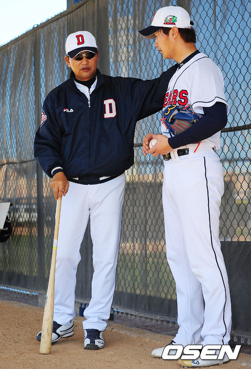 26일(이하 한국시간) 미국 애리조나주 피오리아 '피오리아 스포츠 콤플렉스'에서 진행된 두산 스프링캠프에서 두산 김진욱 감독이 김창훈을 격려하고 있다.