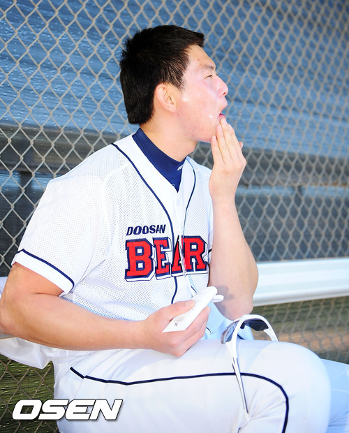 26일(이하 한국시간) 미국 애리조나주 피오리아 '피오리아 스포츠 콤플렉스'에서 진행된 두산 스프링캠프에서 두산 이성열이 선크림을 바르고 있다.