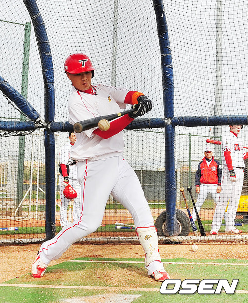 KIA 거포 김상현(31)이 애리조나 스프링캠프에서 1루수 수업을 받고 있다. 작년 미야자키 전지훈련지에서는 3루수에서 좌익수로 변신했고 올해는 1루수 포지션 변경에 도전하고 있다. 이미 작년 틈틈히 1루를 봤기 때문에 큰 문제는 없다. 다만 불안한 1루 훈련이다.
