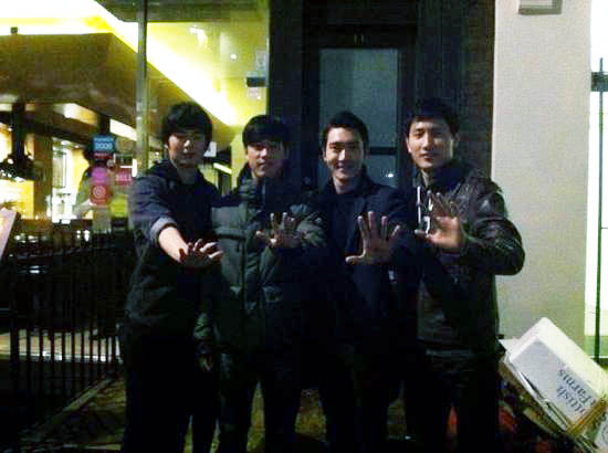 사진 속에는 식당 앞에서 네 사람이 나란히 선 채 손바닥을 내미는 '슈퍼주니어식' 포즈를 취하고 있다.