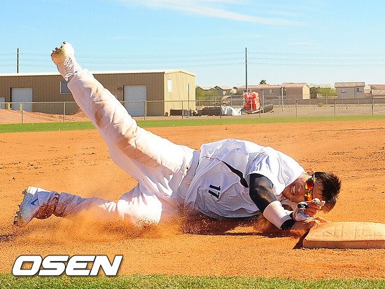 26일(이하 한국시간) 미국 애리조나주 피오리아 '피오리아 스포츠 콤플렉스'에서 진행된 두산 스프링캠프에서 두산 임재철이 슬라이딩을 하고 있다.