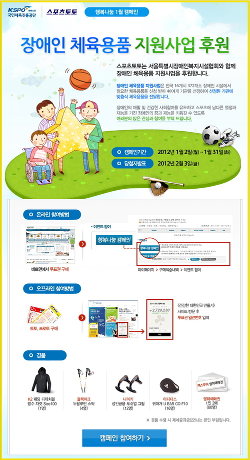 [스포츠토토] 국민체육진흥공단(www.kspo.or.kr)이 발행하는 체육진흥투표권 수탁사업자인 스포츠토토(www.sportstoto.co.kr)가 서울특별시 장애인복지시설협회와 함께 이 달 말일까지 진행하는 '행복나눔 1월 캠페인'의 마감이 임박했다.