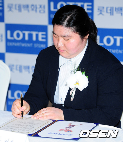 [OSEN = 백승철 기자] 26일 오후 서울 소공동 롯데호텔에서 열린 '롯데백화점 장미란 선수 및 재단 후원 협약식'에서 장미란이 협약서에 서명을 하고 있다.