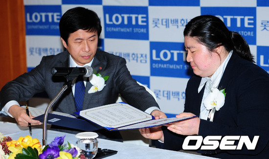 [OSEN = 백승철 기자] 26일 오후 서울 소공동 롯데호텔에서 열린 '롯데백화점 장미란 선수 및 재단 후원 협약식'에서 롯데백화점 마케팅부문장 이갑 상무와 장미란이 협약서를 교환하고 있다.