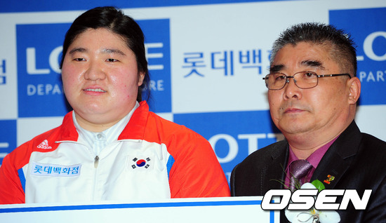 [OSEN = 백승철 기자] 26일 오후 서울 소공동 롯데호텔에서 열린 '롯데백화점 장미란 선수 및 재단 후원 협약식'에서 장미란과 부친 장호철이 기념촬영을 갖고 있다.
