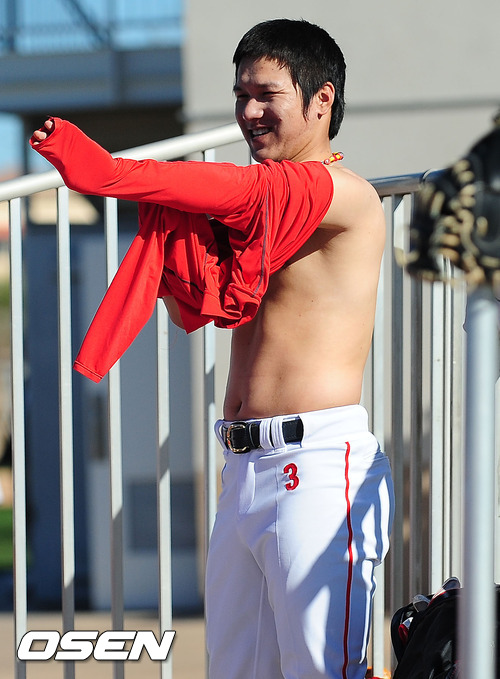 25일(한국시간) 미국 애리조나주 서프라이즈 '캔자스시티 로열스 컴플렉스'에서 진행된 KIA 스프링캠프에서 김선빈이 유니폼을 갈아입고 있다.