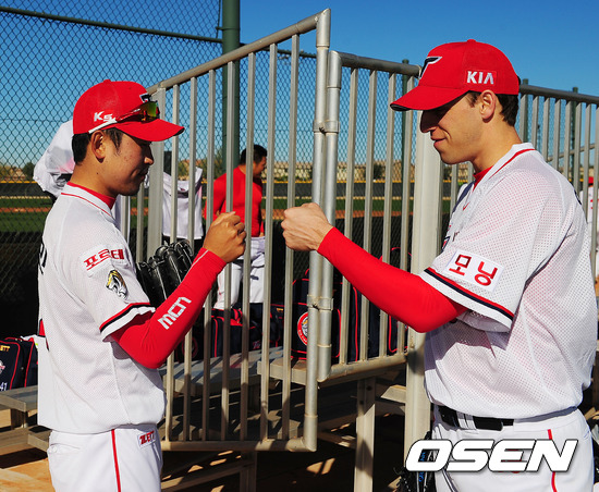25일(한국시간) 미국 애리조나주 서프라이즈 '캔자스시티 로열스 컴플렉스'에서 진행된 KIA 스프링캠프에서 윤석민과 알렉스 그라만이 훈련전 하이파이브를 하고 있다.