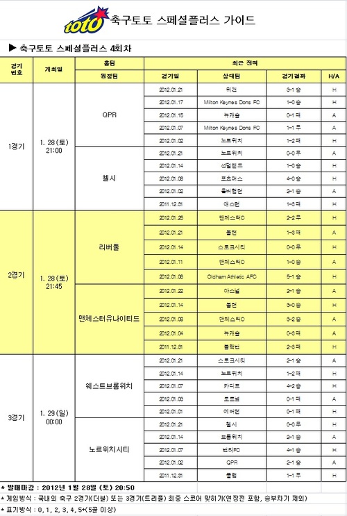 3경기 웨스트브롬위치-노르위치시티전에서는 브롬위치의 승리 예상이 38.22%로 무승부 33.57%, 노르위치 승리 28.19%보다 다소 높게 나타났다. 스코어별 투표율은 1-1 양팀 무승부 17.93%가 가장 높게 나타났다. 한편, 이번 축구토토 스페셜플러스 4회차 게임은 28일 오후 8시 50분까지 게임에 참여할 수 있으며 경기가 모두 종료된 후에 결과가 공식 발표된다.