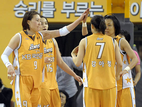 KB스타즈는 27일 청주종합체육관에서 벌어진 2011~2012시즌 신세계 이마트 여자 프로농구에서 리그 1위 신한은행을 82-62로 꺾었다. 정선민(19점)과 변연하(16점)는 36점을 합작하며 팀 승리를 주도했고 정선화와 강아정 역시 각각 17점과 14점을 기록하며 힘을 보탰다.