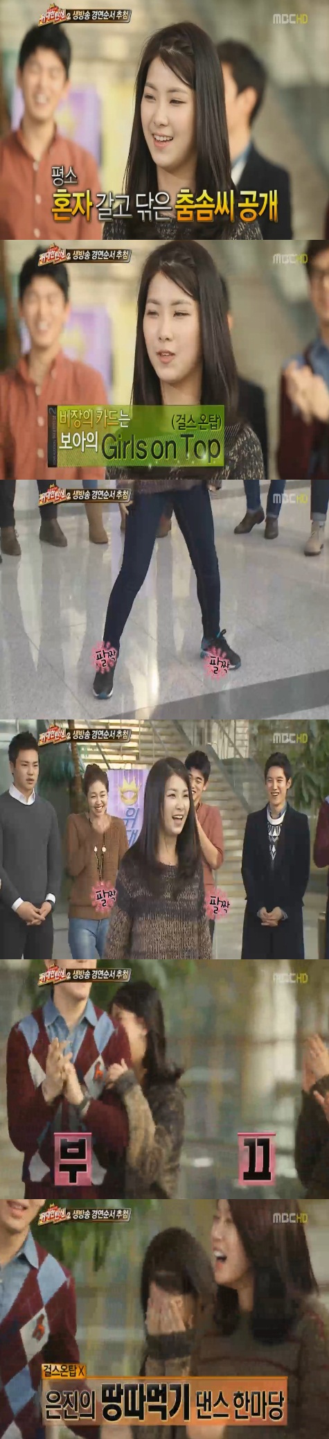 파워풀한 댄스의 원조 보아의 '걸스 온 탑' 노래에 맞춰 전인진은 최선을 다해 춤을 췄지만 마치 땅따먹 놀이를 하듯 콩콩 뛰는 듯한 율동을 보여줘 웃음을 자아냈다. 전은진은 댄스를 선보인 후 부끄러워 어쩔 줄 몰라했다.
