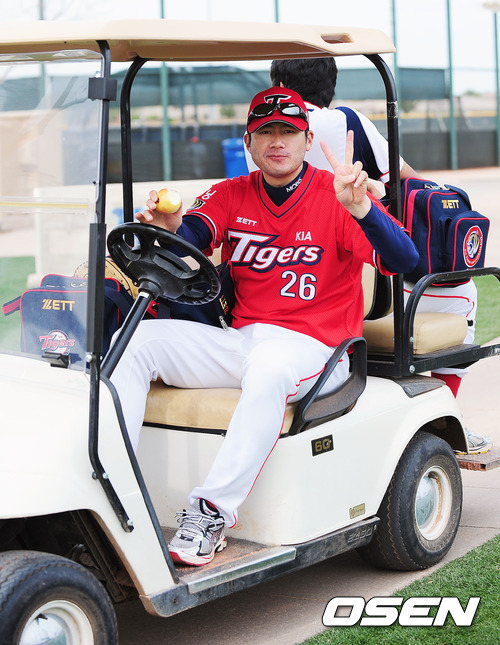 28일(한국시간) 미국 애리조나주 서프라이즈 '캔자스시티 로열스 컴플렉스'에서 진행된 KIA 스프링캠프에서 서재응이 카트를 몰며 브이사인을 보내고 있다.