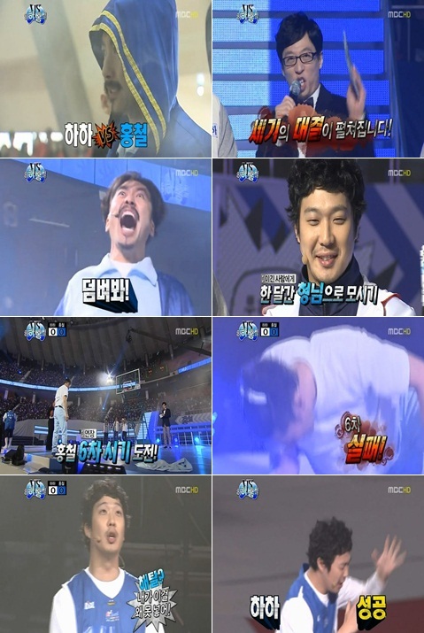 대결은 하하가 제안한 종목인 ‘자유투’, ‘닭싸움’ ‘알까기’, 홍철 제안 종목인 ‘간지럼 참기’ ‘캔 뚜껑 따기’ ‘동전 줍기’, 그리고 제작진이 제안한 ‘퀴즈’와 시청자가 제안한 종목 세 가지까지 더해 총 10라운드로 진행됐다.