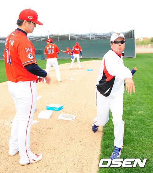 28일(한국시간) 미국 애리조나주 서프라이즈 '캔자스시티 로열스 컴플렉스'에서 진행된 KIA 스프링캠프에서 선동렬 감독이 한기주에게 투구폼을 보이고 있다.