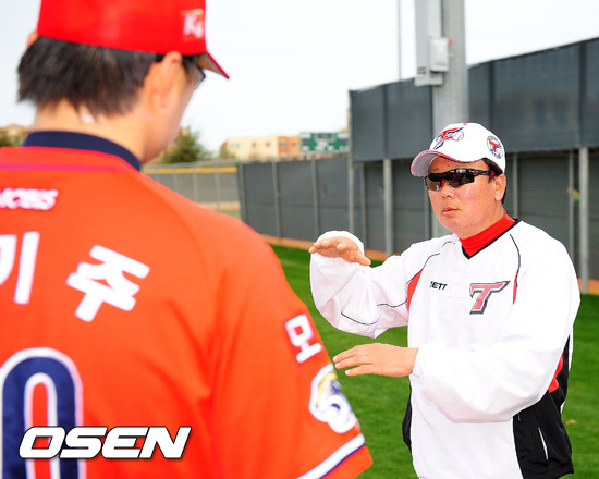 28일(한국시간) 미국 애리조나주 서프라이즈 '캔자스시티 로열스 컴플렉스'에서 진행된 KIA 스프링캠프에서 선동렬 감독이 한기주에게 투구에게 대해 설명을 하고 있다.