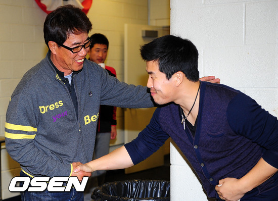 28일(한국시간) 미국 애리조나주 서프라이즈 '텍사스 레인저스 볼파크'에서 진행된 넥센 스프링캠프에서 식당에서 김시진 감독이 김병현과 악수를 나누고 있다.