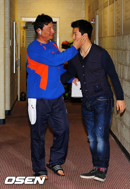 28일(한국시간) 미국 애리조나주 서프라이즈 '텍사스 레인져스 볼파크'에서 진행된 넥센 스프링캠프 식당에서 심재학 코치가 김병현 얼굴을 만지며 반가워하고 있다.