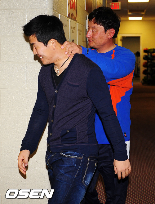 28일(한국시간) 미국 애리조나주 서프라이즈 '텍사스 레인저스 볼파크'에서 진행된 넥센 스프링캠프의 식당에서 김병현과 심재학 코치가 반가움을 표시하고 있다.