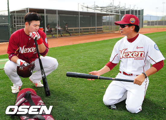 28일(한국시간) 미국 애리조나주 서프라이즈 '텍사스 레인저스 볼파크'에서 진행된 넥센 스프링캠프에서 박병호가 타격연습중 김성갑 코치와 배트에 대해 얘기를 나누고 있다.
