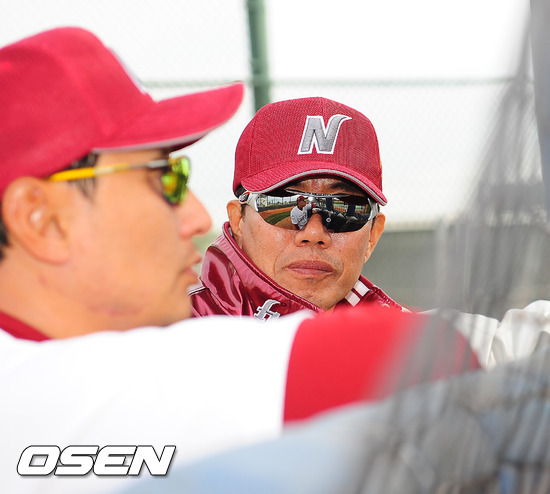 28일(한국시간) 미국 애리조나주 서프라이즈 '텍사스 레인저스 볼파크'에서 진행된 넥센 스프링캠프에서 김시진 감독이 심재학 코치와 얘기를 나누고 있다.