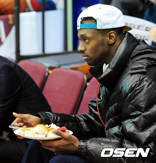 동부 벤슨이 관중석에서 경기전 이벤트를 관람하고 있다.