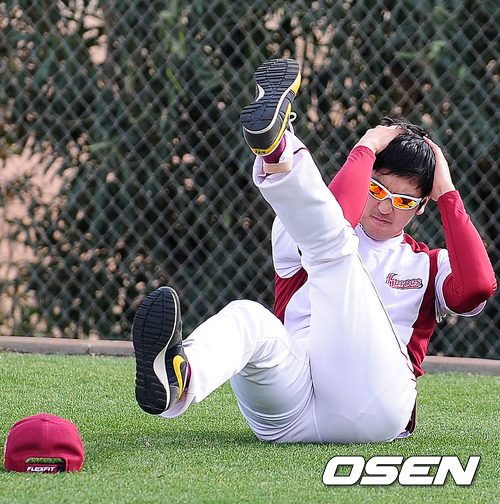 28일(한국시간) 미국 애리조나주 서프라이즈 '텍사스 레인저스 볼파크'에서 진행된 넥센 스프링캠프에서 심수창이 몸을 풀고 있다.