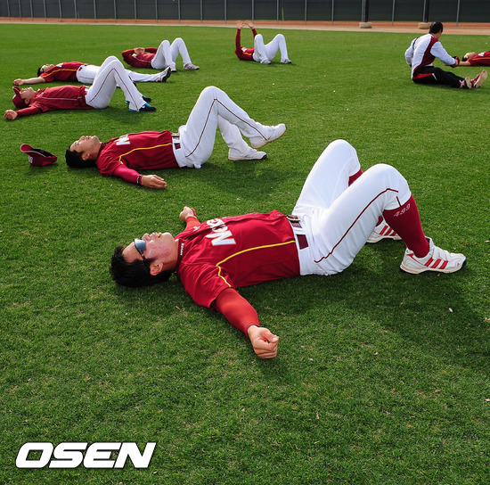 28일(한국시간) 미국 애리조나주 서프라이즈 '텍사스 레인저스 볼파크'에서 진행된 넥센 스프링캠프에서 넥센 선수들이 훈련 후 휴식을 취하고 있다.