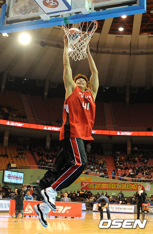 덩크 콘테스트에 참가한 KGC 오세근이 덩크슛을 시도하고 있다.