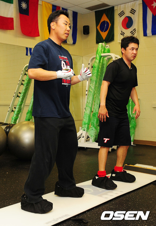 28일(한국시간) 미국 애리조나주 서프라이즈 '캔자스시티 로열스 컴플렉스'에서 진행된 KIA 스프링캠프 야간 웨이트 훈련에서 이범호가 가볍게 춤을 추고 있다.