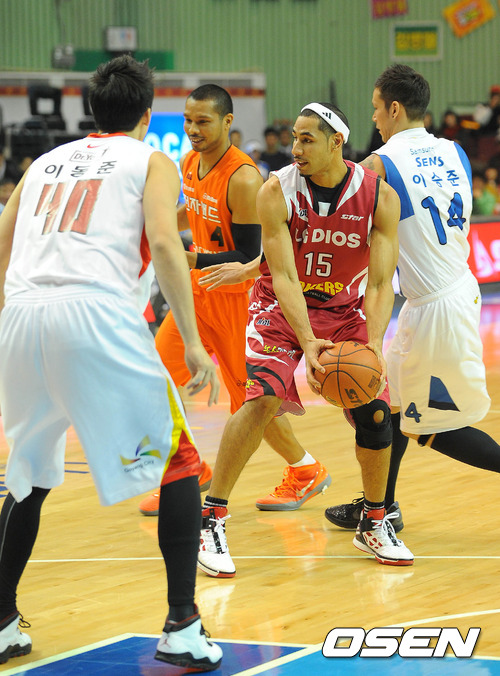 문태종, 문태영 형제와 이승준, 이동준 형제 대결에서 문태영, 문태종 형제가 이동준, 이승준 형제의 수비를 돌파하고 있다.