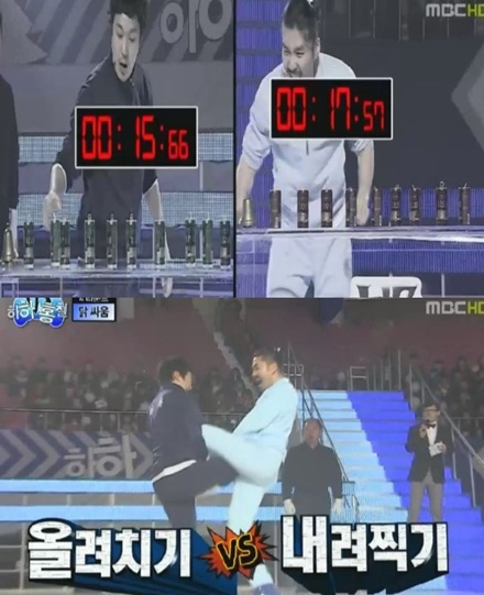 이날 방송에선 '하하VS홍철' 대결의 두 번째 이야기가 그려졌다. 지난주 방송분에서 자유투 대결에 이겨 승기를 잡았던 하하는 이날 방송에서 간지럼 참기를 제외한 캔 따기, 일바지로 공받기, 닭싸움에서 모두 이겨 4:1이라는 스코어로 홍철을 앞서나갔다.