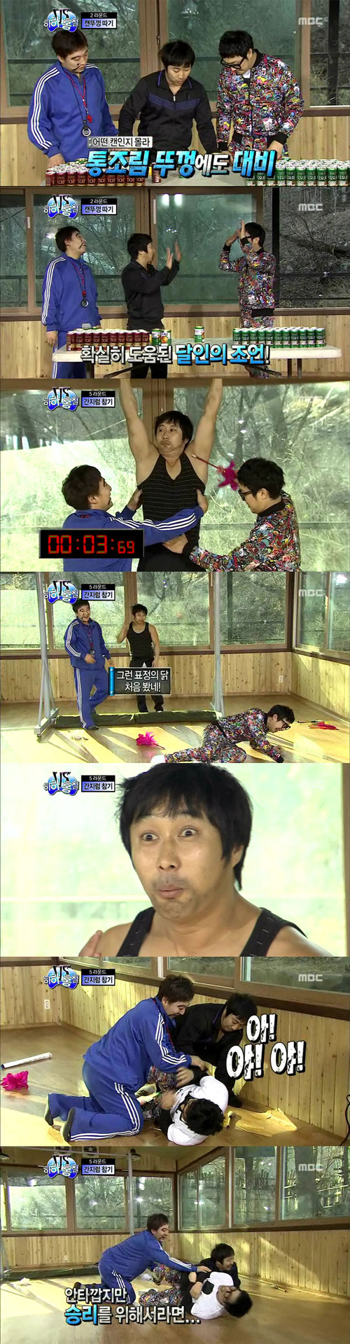 김병만의 활약은 간지럼참기 대결에서도 웃음을 유발했다. 먼저 철봉에 매달려 간지럼 참기 시범을 보인 김병만은 5초도 버티지 못하고 백기를 들고 말았다. 이를 지적하자 김병만은 "밖에 닭을 봤다. 그런 표정의 닭 처음 봤다"고 능청을 떨기도 했다.