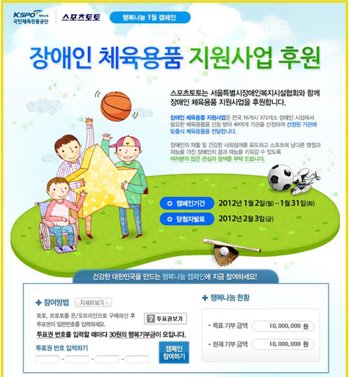 건전한 기부문화 정착을 위해 실시하는 행복나눔 캠페인은 매달 1000만원을 목표로 스포츠토토 팬들의 기부금을 모아 어려운 이웃을 돕는 이벤트다. 1월에 적립된 기부금은 장애인 체육용품 지원사업 후원에 사용될 예정이다.