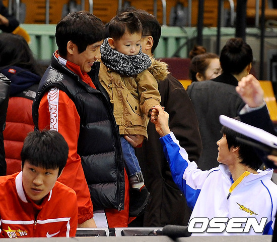 29일 오후 서울 잠실 실내체육관에서 열린 '2011-2012시즌 KB 국민카드 프로농구 올스타전' 경기전 모비스 양동근이 아들을 삼성 이시준에게 소개하고 있다.