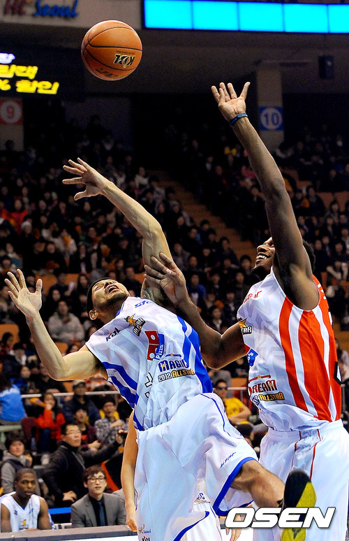 29일 오후 서울 잠실 실내체육관에서 열린 '2011-2012시즌 KB 국민카드 프로농구 올스타전' 경기 2쿼터 전태풍과 윌리엄스가 리바운드를 다투고 있다.