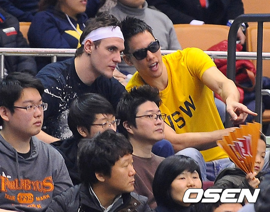 29일 오후 서울 잠실 실내체육관에서 열린 '2011-2012시즌 KB 국민카드 프로농구 올스타전' 경기 이동준과 가빈이 경기를 지켜보고 있다