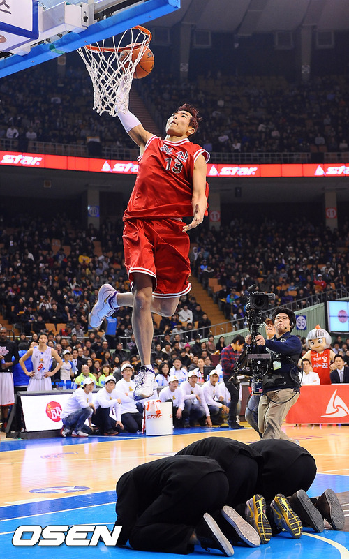 29일 오후 서울 잠실 실내체육관에서 열린 '2011-2012시즌 KB 국민카드 프로농구 올스타전' 경기 하프타임 덩크슛 콘테스트에서 김현민이 덩크슛을 시도하고 있다.
